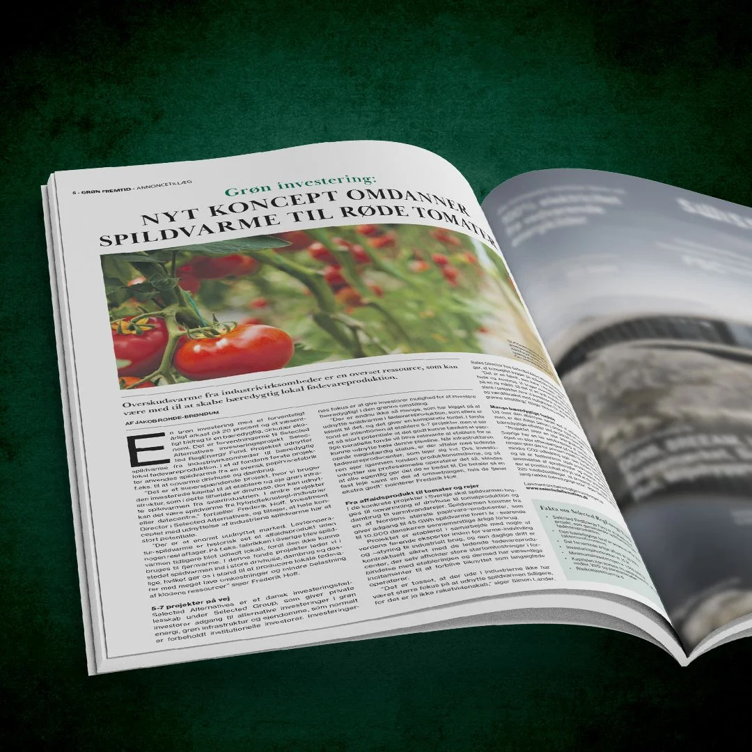 En grøn investering med et forventeligt årligt afkast på +15 procent og et væsentligt bidrag til en bæredygtig, cirkulær økonomi. Det er forventningerne til Selected Alternatives investeringsprojekt Selected RegEnergy Fund. Projektet udnytter spildvarme fra industrivirksomheder til bæredygtig lokal fødevareproduktion. I et af fondens første projekter anvendes spildvarme fra en svensk papirvarefabrik f.eks. til at opvarme drivhuse.